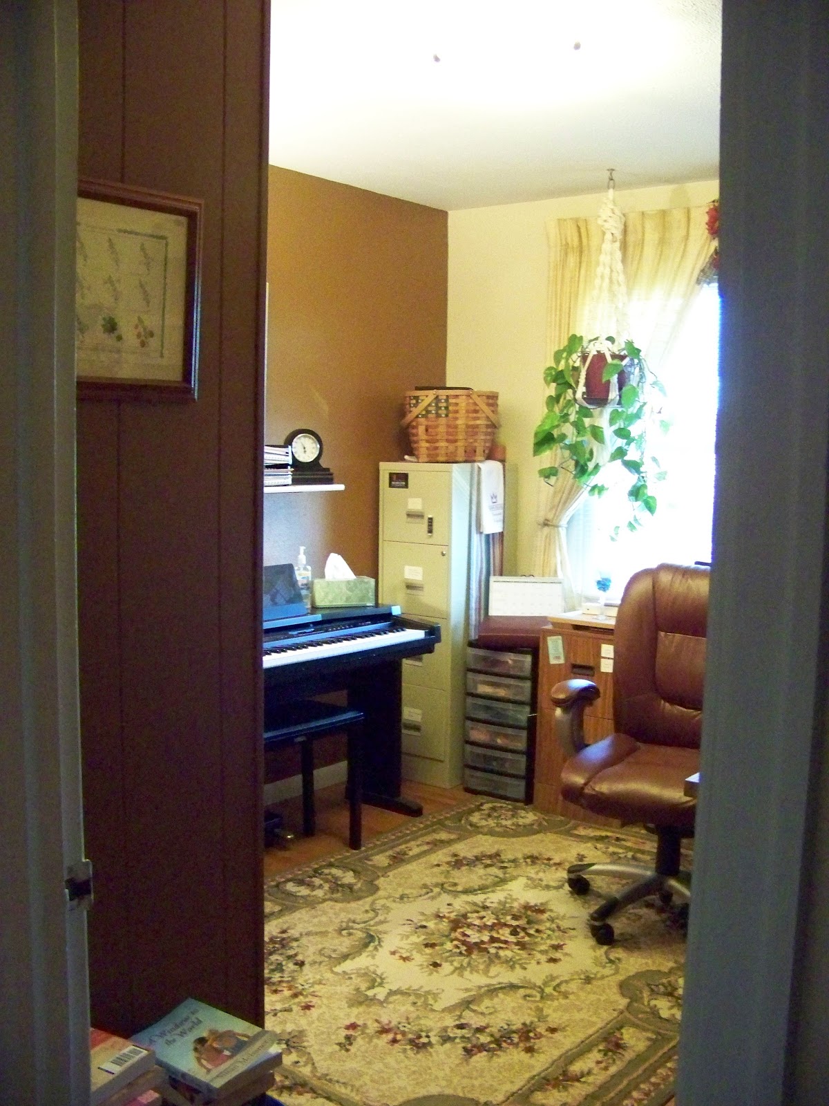 I really wanted to paint the wall behind my desk that has all the book shelves. However, I wasn't too excited about moving everything. Plus, I knew I'd have to go buy more paint. But then I got thinking that I'd just start with two walls and see what I thought before moving too much furniture. I give piano lessons in my office, so I wanted to inspire my students as well.